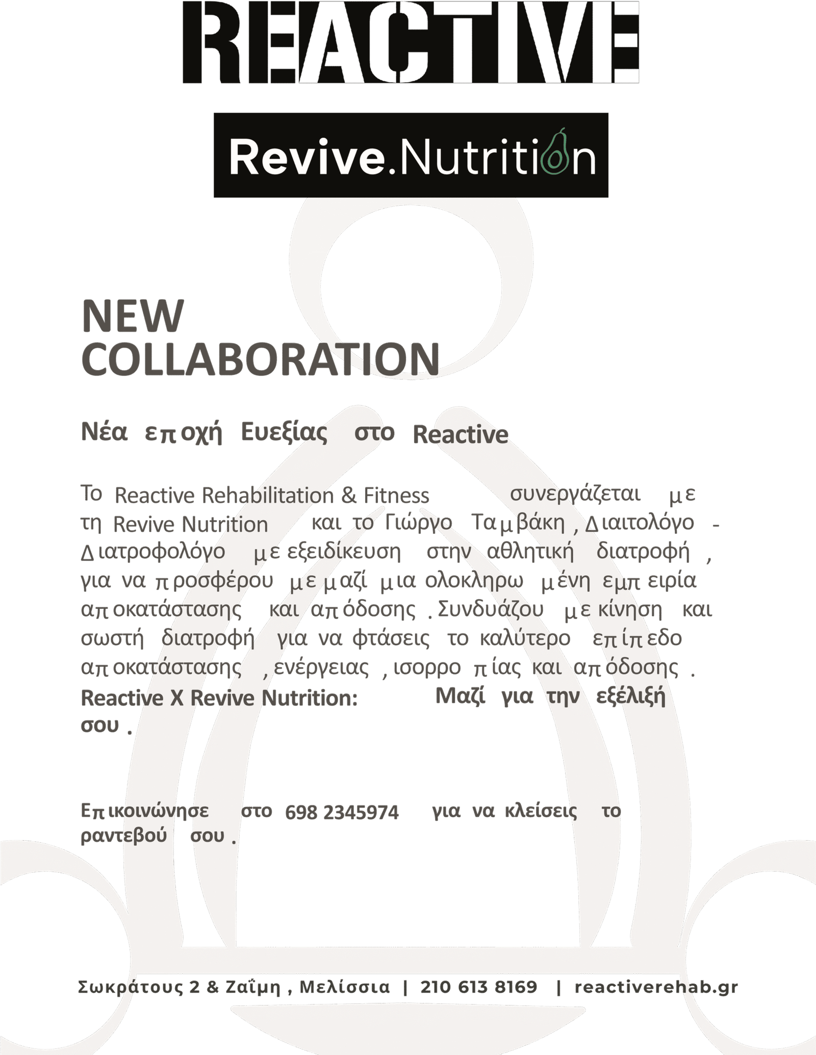 Η επαναφορά στην προηγούμενη (καλή, φυσιολογική) κατάσταση. Συμβαδίζοντας με τον παραπάνω ορισμό, στόχος της ομάδας μας είναι ο ασθενής να επανέλθει στην καλή του κατάσταση ( και γιατί όχι σε ακόμα καλύτερη). Η ομάδα μας συνδυάζει πρακτικές τεχνικές όπως Manual Therapy, μάλαξη, βελονισμό, κινητοποίηση μαλακών μορίων, αλλά και θεωρητικές όπως ενημέρωση και εκπαίδευση του ασθενή για την παθολογία του και τη διαχείριση της καθώς και τις διαθέσιμες λύσεις που μπορούμε να του προσφέρουμε. Στόχος μας, η επιστροφή του ασθενή στις καθημερινές του δραστηριότητες με ασφάλεια και αυτοπεποίθηση ώστε να κερδίσει πάλι την ποιότητα ζωής που του αξίζει.